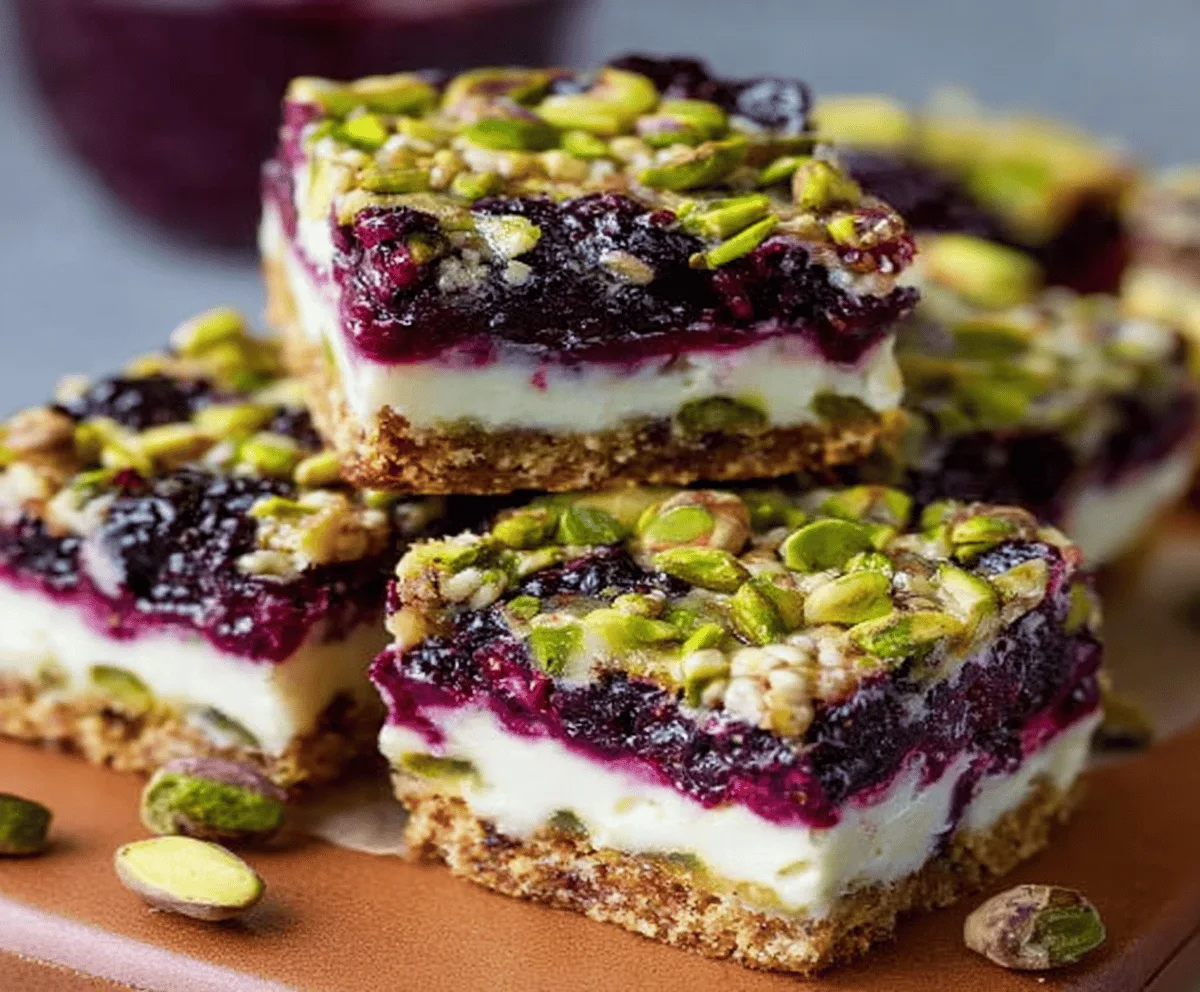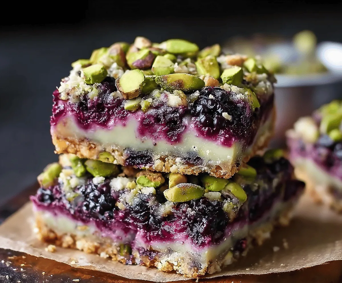 Blackberry Pistachio Dream Bars are a delightful treat that combine juicy blackberries with crunchy pistachios in a sweet, buttery crust. These bars have a wonderful mix of tart and nutty flavors, and the texture is just right—soft and chewy with little pops from the nuts and berries.