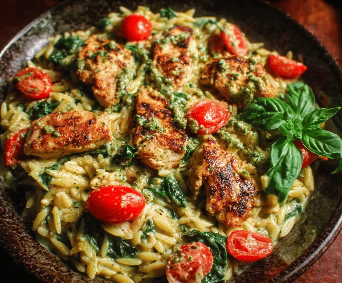 Creamy Chicken Orzo With Spinach, Cherry Tomatoes, And Basil Pesto