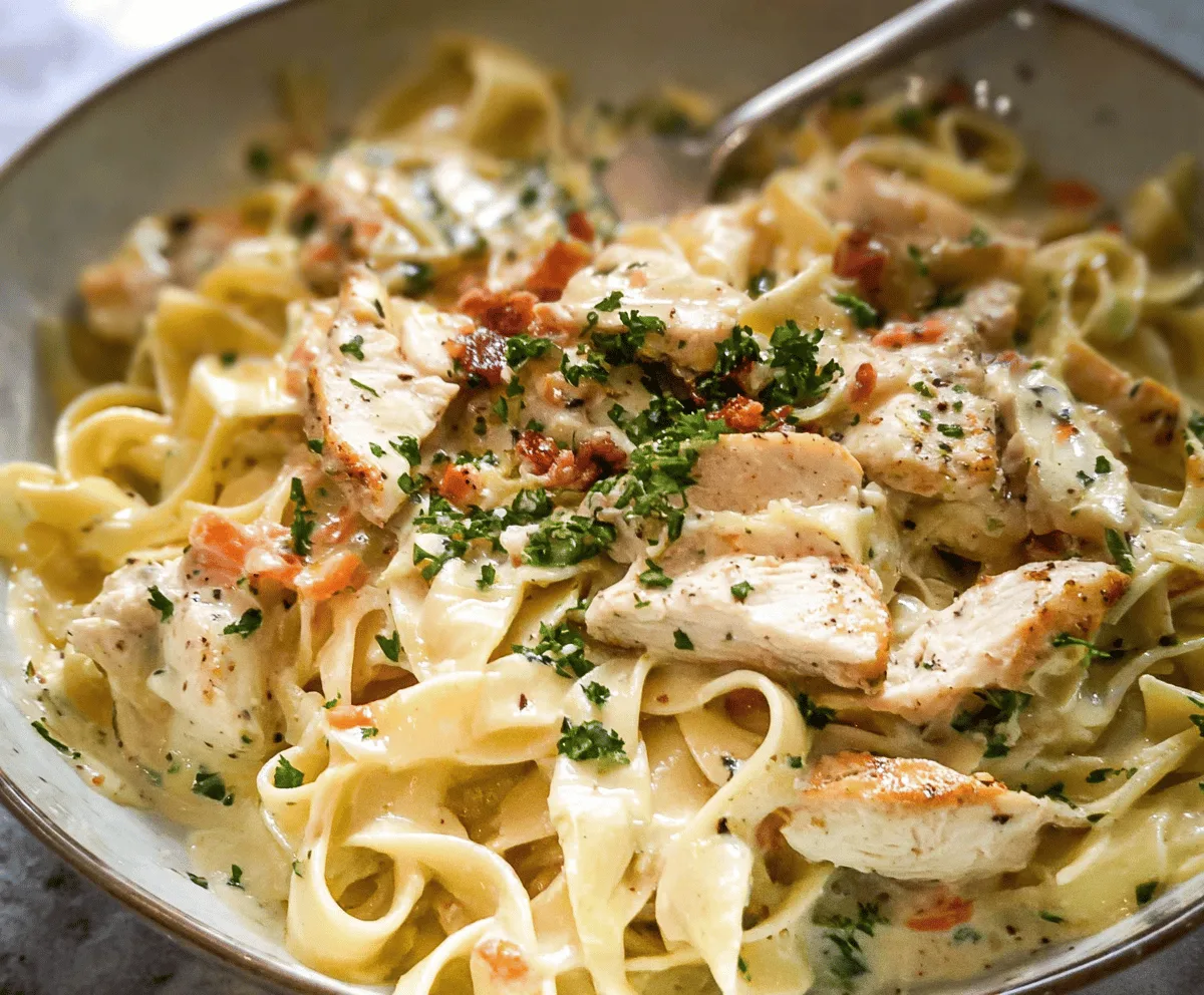 Add the cooked pasta and sliced chicken back into the skillet. Toss everything well to coat pasta and chicken with the sauce. Sprinkle with crispy bacon, chopped parsley, and freshly ground black pepper. Add a pinch of red pepper flakes if you want a little heat. Serve right away while it’s warm and creamy.