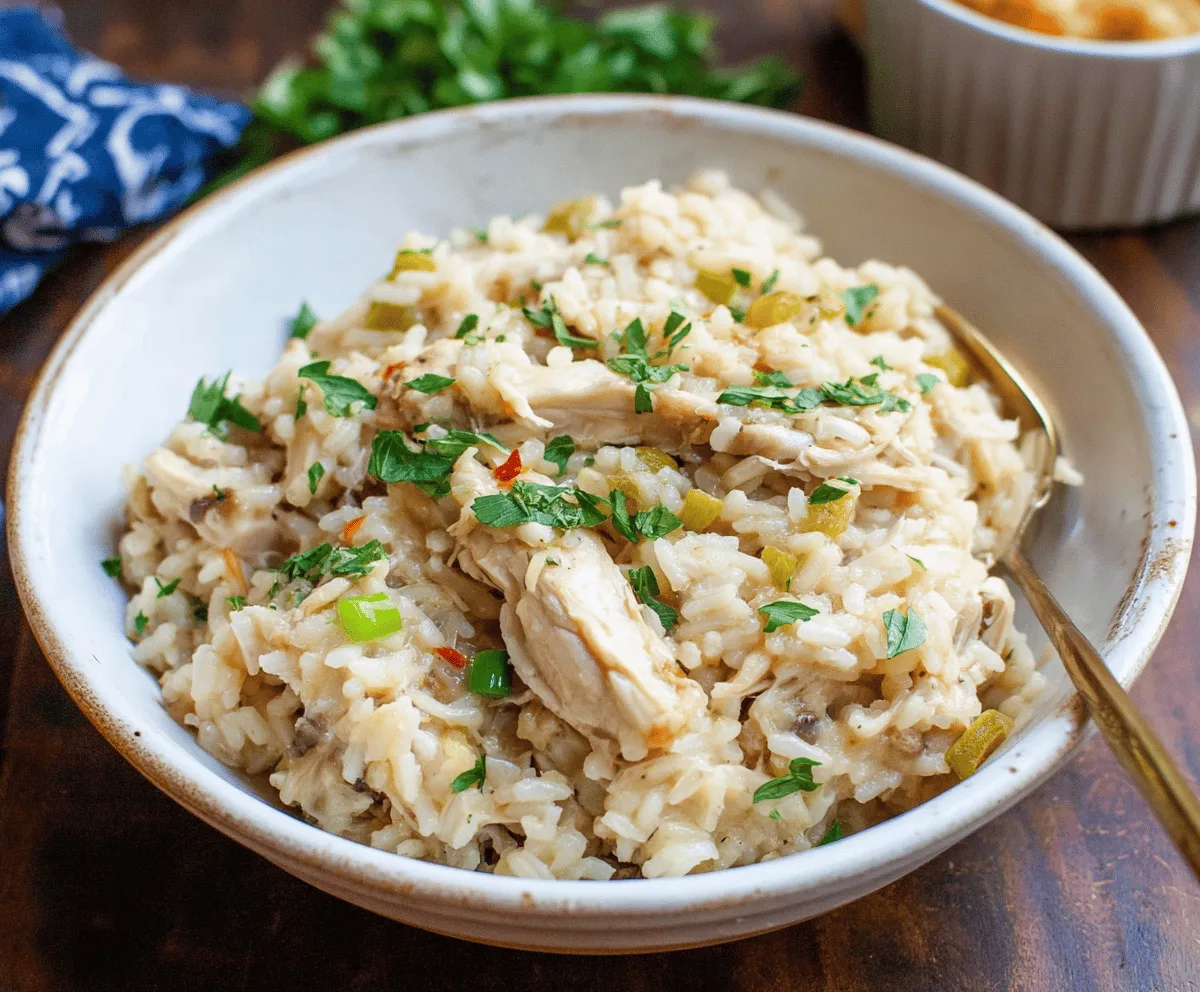 Before serving, shred the chicken breasts with two forks right in the crock pot, and gently mix everything together so the rice and chicken combine well. Garnish with chopped fresh parsley for a burst of color and freshness, then serve hot.