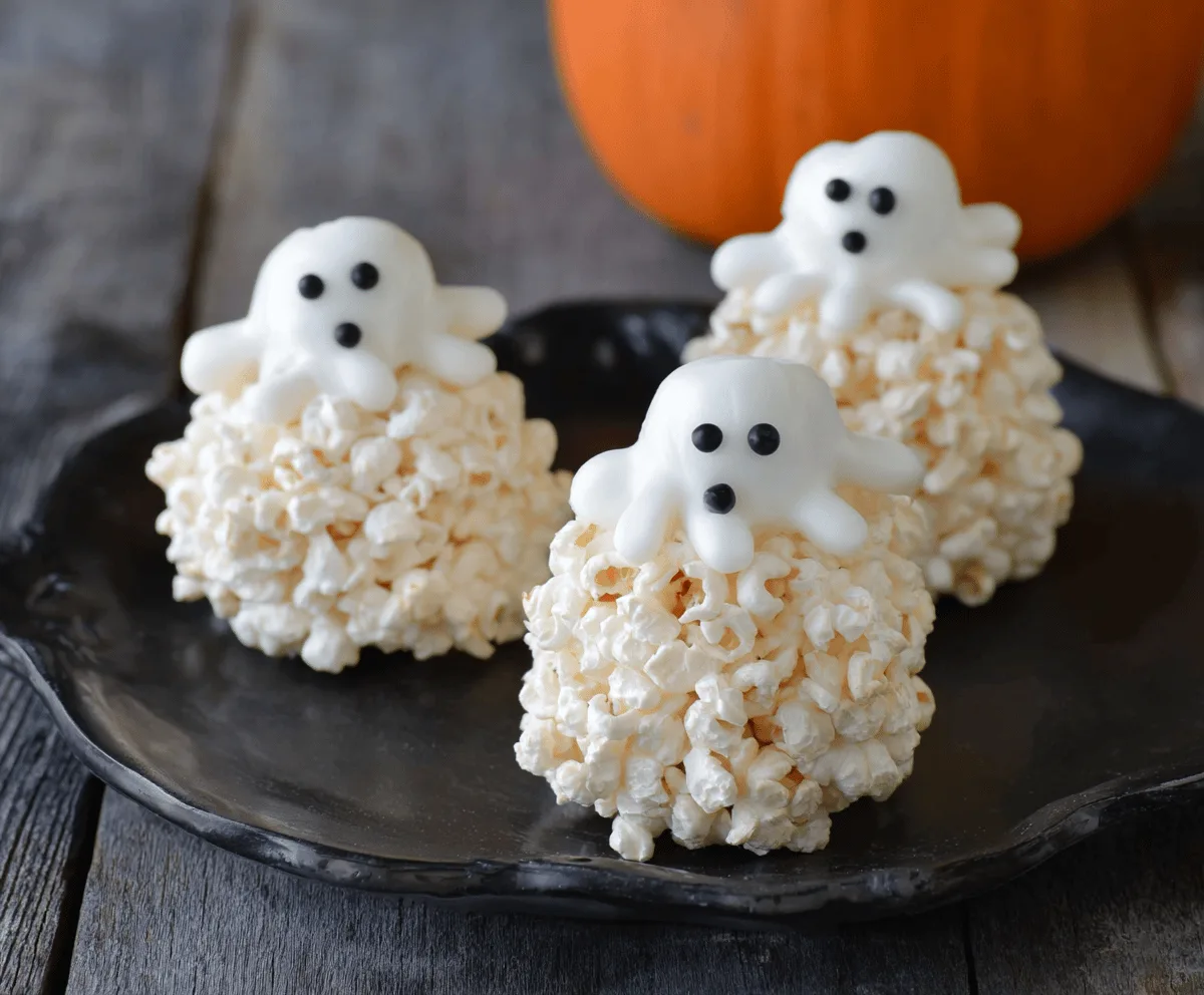 While the balls set, melt white candy melts or white chocolate chips in a microwave-safe bowl. Heat in 30-second bursts, stirring in between, until smooth. Carefully pipe or spoon ghost shapes on top of each popcorn ball. For the ghost’s arms or tentacles, add small blobs on the sides and bottom to create that cute spooky look.