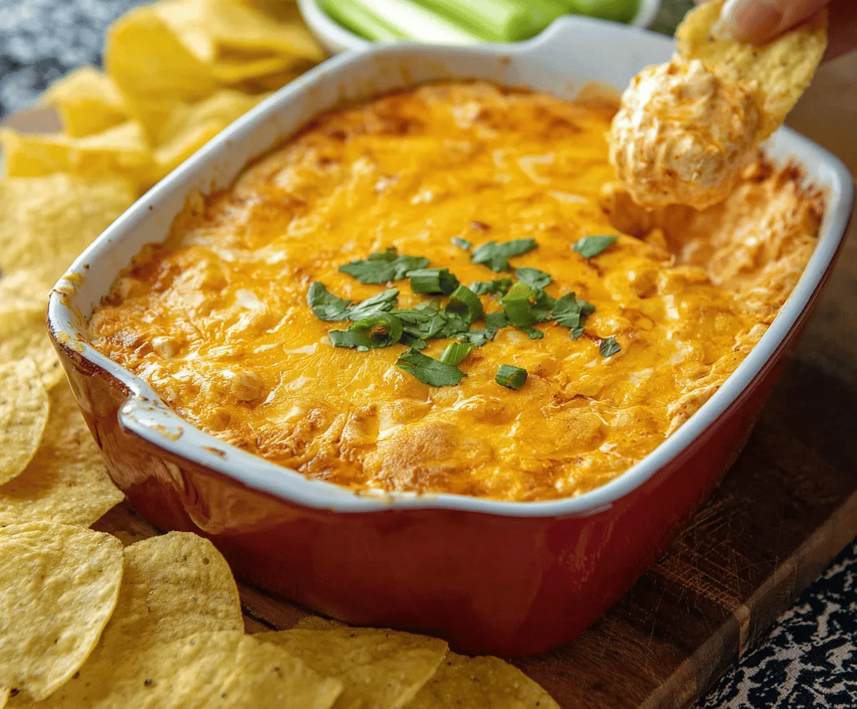 Once baked, remove the dip from the oven and let it cool just a bit. Sprinkle chopped green onions on top for a fresh touch if you like. Serve the warm dip with tortilla chips, celery sticks, or crackers, and enjoy every creamy, spicy bite!
