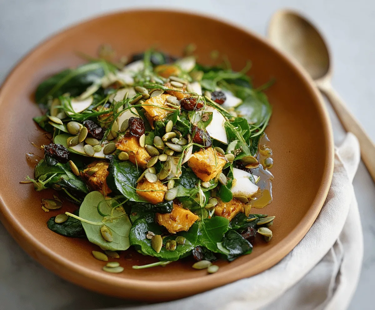 This Pumpkin Seed & Apple Cider Salad is a fresh and crunchy mix that combines the nutty flavor of roasted pumpkin seeds with the sweet tang of apple cider vinaigrette. It’s bright, crisp, and perfect for when you want something light but still packed with interesting flavors. The salad usually includes fresh greens, sliced apples, and sometimes a little cheese or dried fruit to round it out.