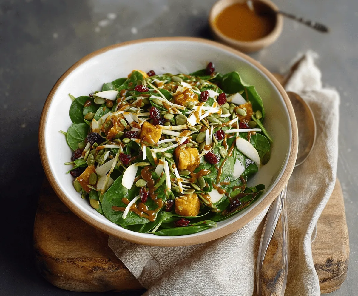 Place the baby spinach in a large bowl. Add the roasted butternut squash, toasted pumpkin seeds, dried cranberries, shaved coconut flakes or sliced almonds, and the sliced apple. Drizzle the apple cider dressing over everything.