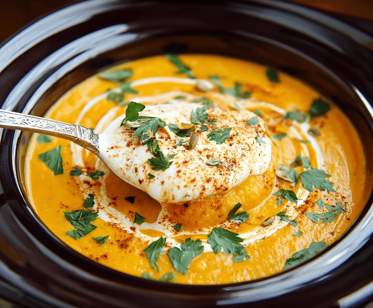 Use an immersion blender to puree the soup directly in the slow cooker until smooth and creamy. If you don’t have one, carefully ladle the soup into a blender in batches and blend until smooth. Add a splash of broth if needed to help blend.