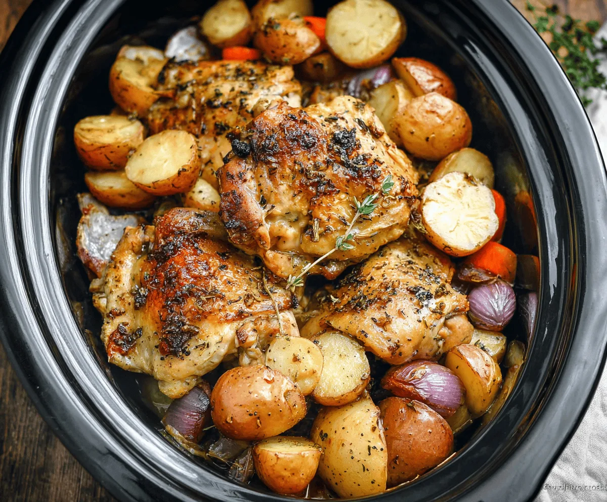 - Use bone-in, skin-on chicken to lock in moisture during slow cooking.