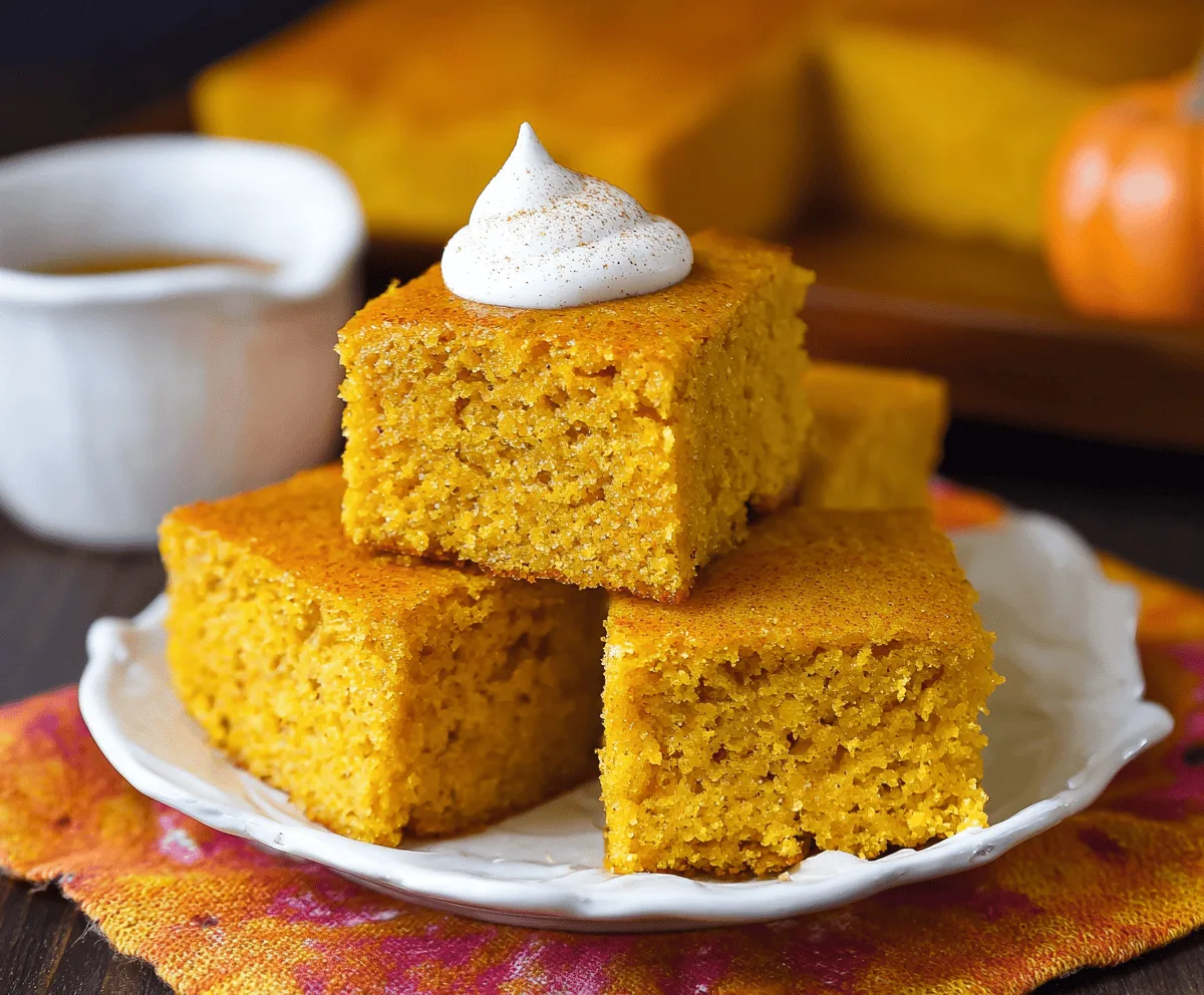 Remove the cornbread from the oven and let it cool slightly before cutting into squares. Serve warm with butter or whipped cream, and sprinkle with a little cinnamon or pumpkin pie spice if you like.